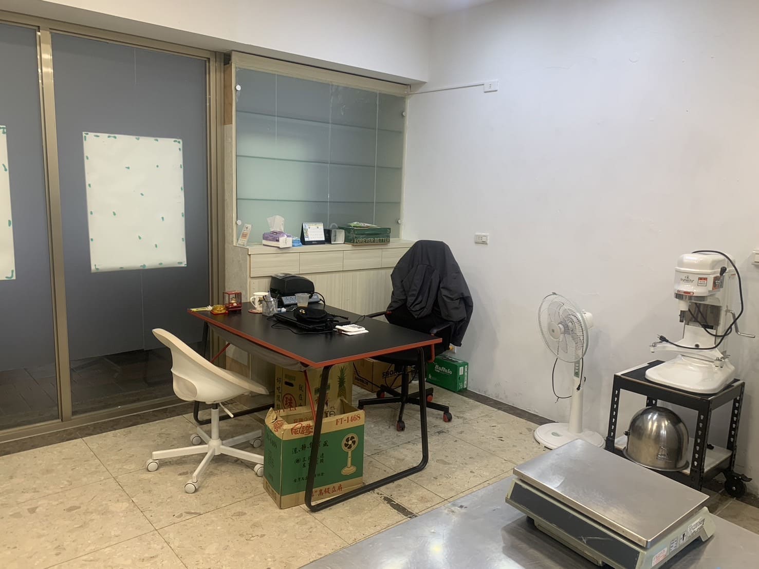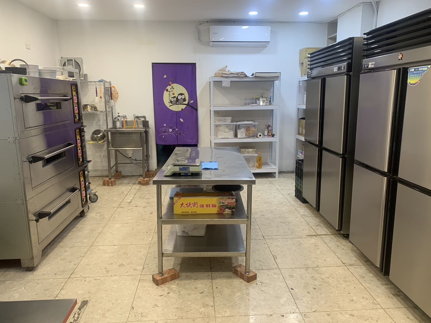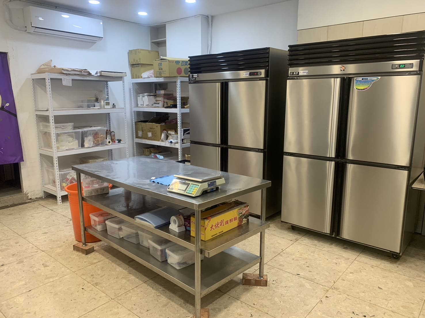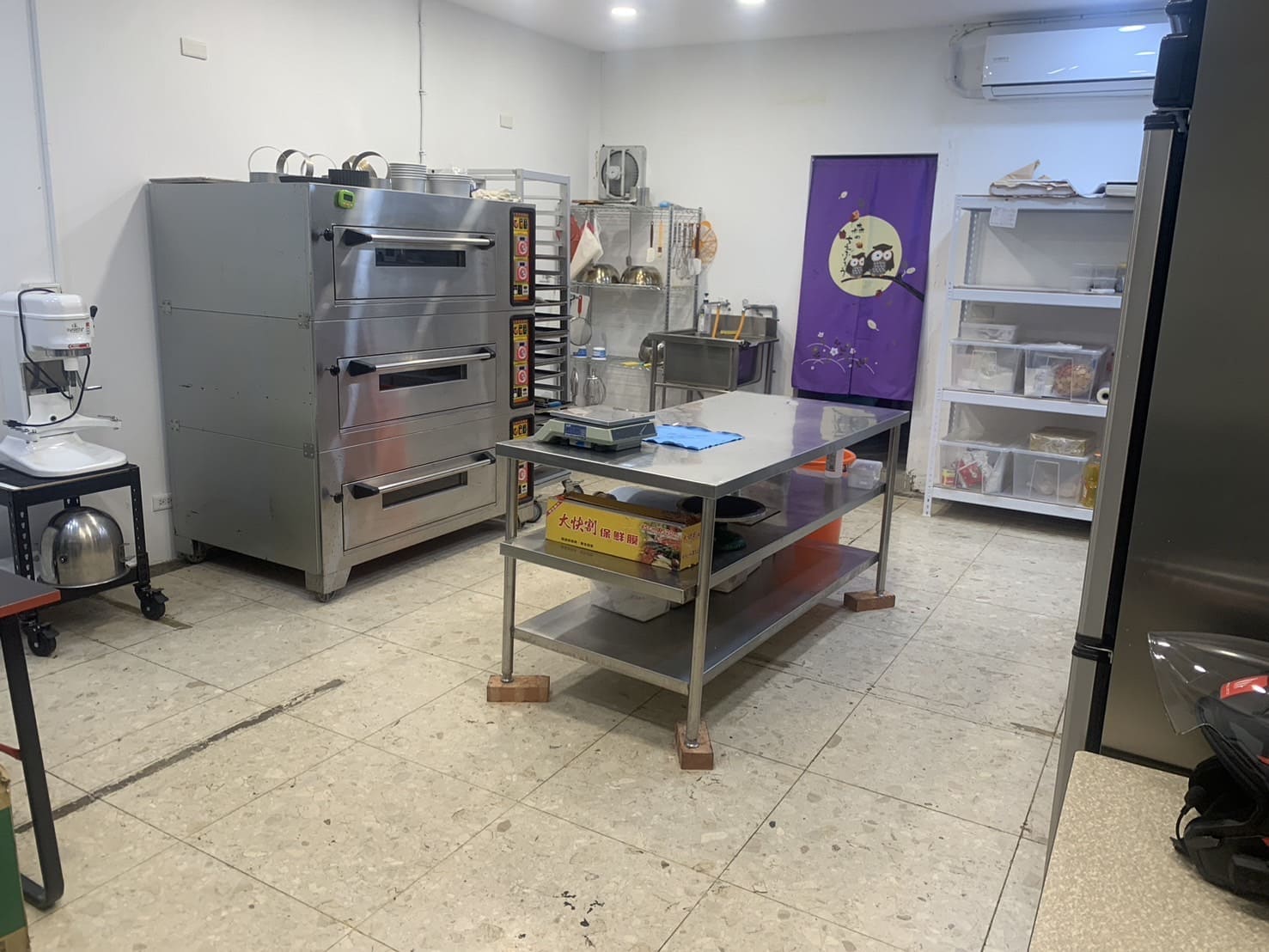 瑞興四門全冷藏冰箱*1、瑞興四門全冷凍冰箱*1、12升攪拌機*1、3層6盤電子烤箱、180*60工作台*1、層列架*2、抬車烤盤*1、冷氣*1、置物架*1、水槽*1、工作桌*1、電腦椅*1、摺疊桌*1、營養標示軟體*1、標籤機*1、電風扇*1等